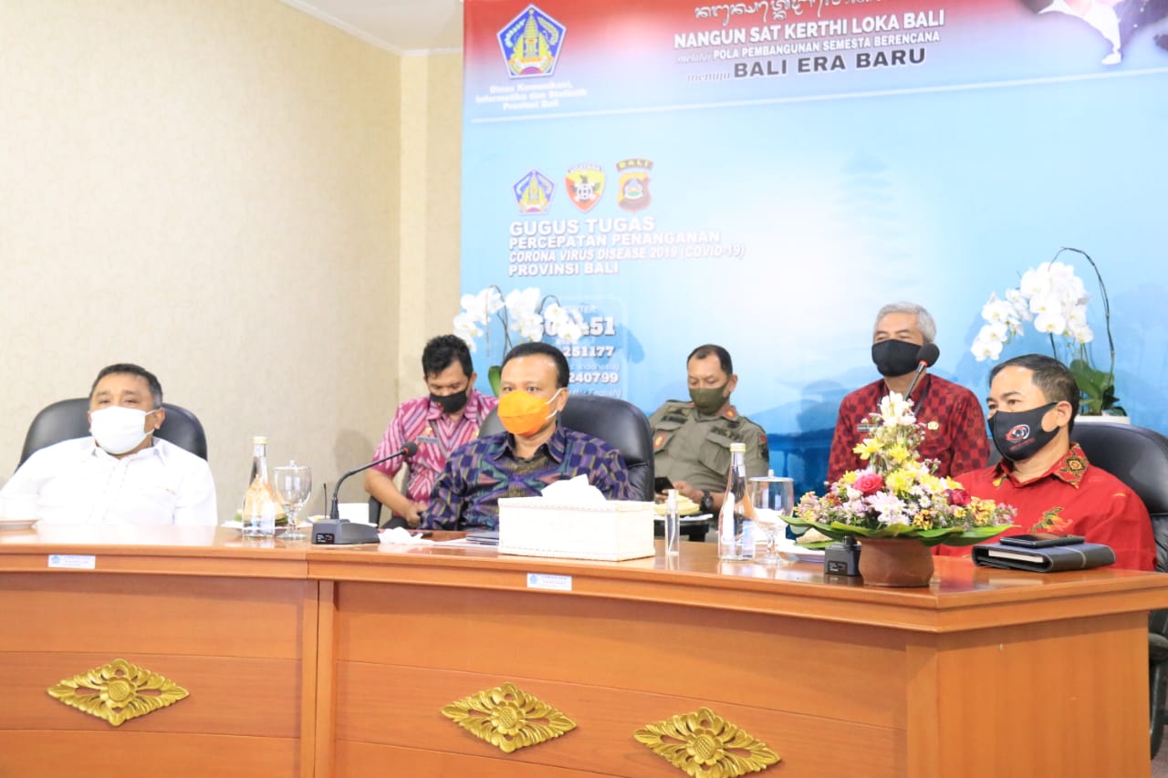 DIKSIMERDEKA.COM, DENPASAR, BALI – Sekretaris Daerah Provinsi Bali Dewa Made Indra dan Ketua Komisi Pemilihan Umum Provinsi Bali I Dewa Agung Lidartawan mengikuti Rapat Koordinasi Khusus (Rakorsus) virtual membahas pemetaan kerawanan serta penegakan hukum dalam Pilkada serentak tahun 2020 yang dilaksanakan Menteri Koordinator Bidang Politik, Hukum, dan Keamanan (Menkopolhukam) dari Ruang Video Conference Kantor Diskominfos, Jumat (14/9).
