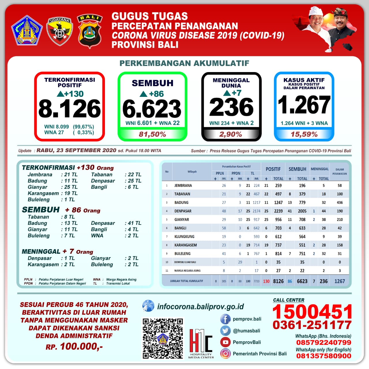 DIKSIMERDEKA.COM, DENPASAR, BALI – Ketua Harian Gugus Tugas Percepatan Penanganan Covid-19 (GTPP) Bali Dewa Made Indra dalam rilisnya menyatakan perkembangan Pandemi Covid-19 di Provinsi Bali per Rabu (23/9) tercatat pertambahan kasus terkonfirmasi sebanyak 130 orang melalui transmisi lokal, sembuh sebanyak 86 orang, dan meninggal dunia sebanyak 7 orang.
