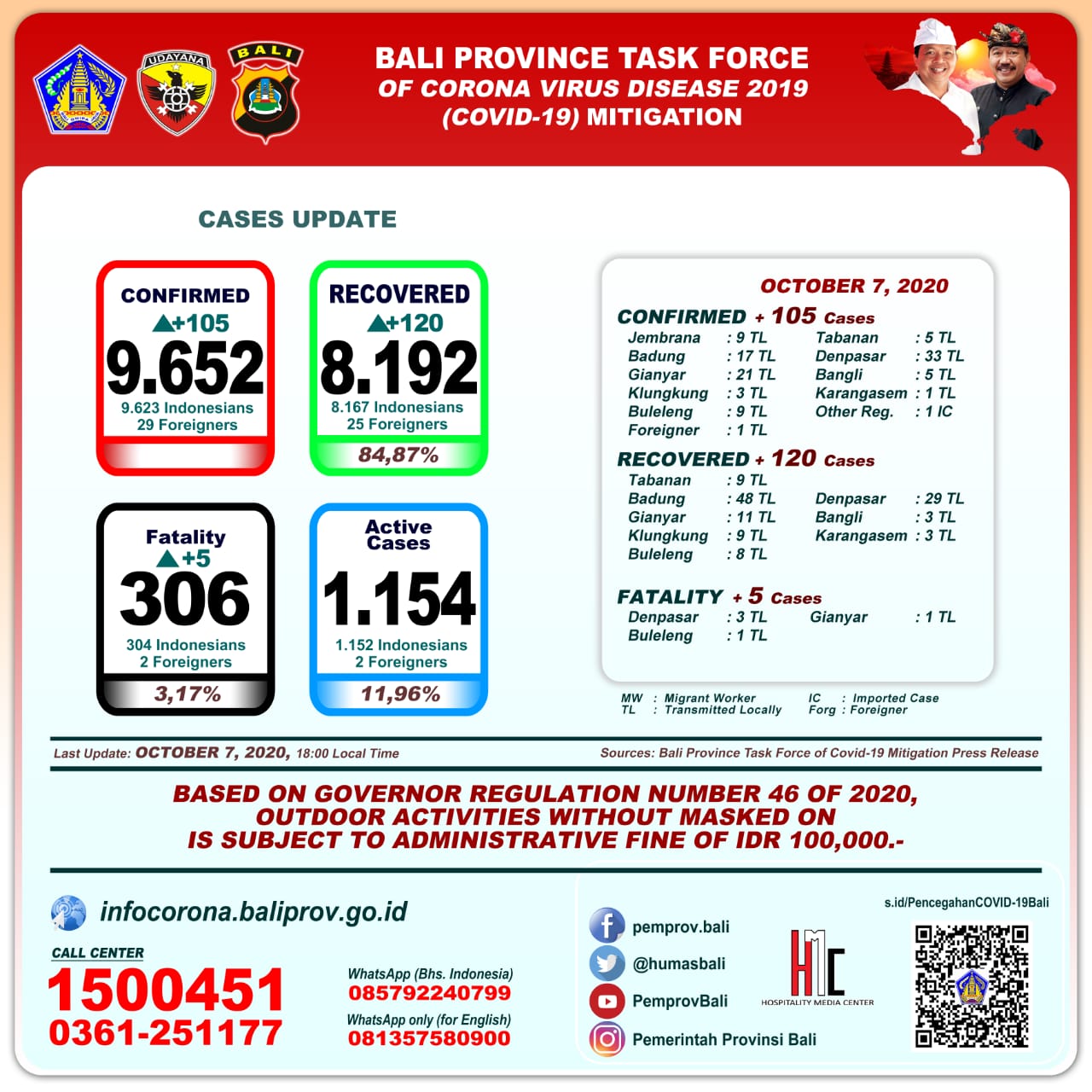 DIKSIMERDEKA.COM, DENPASAR, BALI – Ketua Harian Gugus Tugas Percepatan Penanganan Covid-19 (GTPP) Bali Dewa Made Indra dalam rilisnya menyatakan perkembangan Pandemi Covid-19 di Provinsi Bali per Rabu (7/10) tercatat pertambahan kasus terkonfirmasi sebanyak 105 orang melalui transmisi lokal, sembuh sebanyak 120 orang, dan meninggal dunia sebanyak 5 orang.