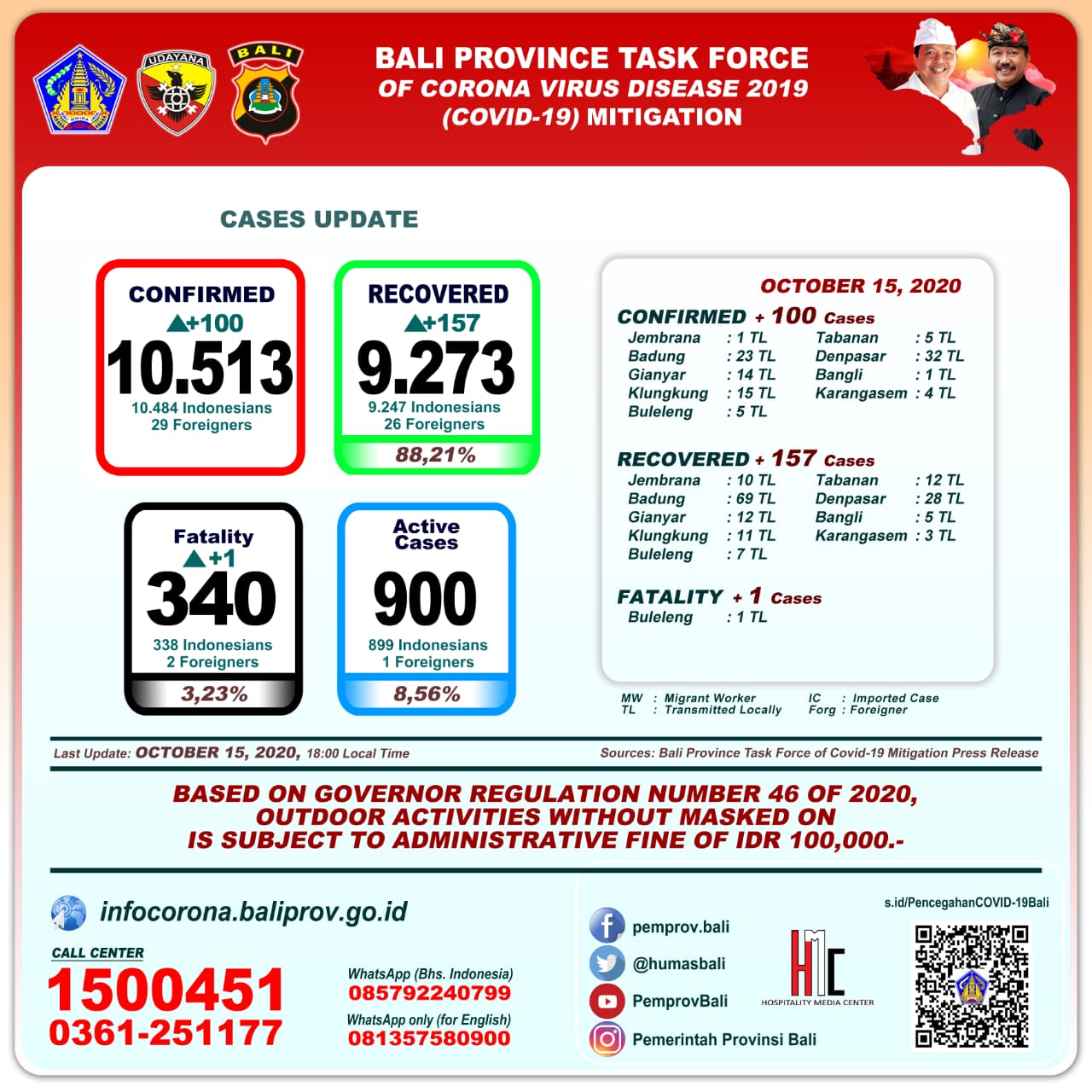 DIKSIMERDEKA.COM, DENPASAR, BALI – Ketua Harian Gugus Tugas Percepatan Penanganan Covid-19 (GTPP) Bali Dewa Made Indra dalam rilisnya menyatakan perkembangan Pandemi Covid-19 di Provinsi Bali per Kamis (15/10) tercatat pertambahan kasus terkonfirmasi sebanyak 100 orang melalui transmisi lokal, sembuh sebanyak 157 orang, dan meninggal dunia sebanyak 1 orang.