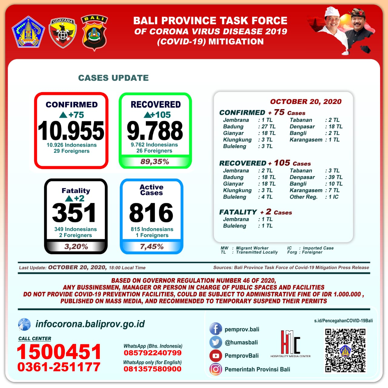 DIKSIMERDEKA.COM, DENPASAR, BALI – Ketua Harian Gugus Tugas Percepatan Penanganan Covid-19 (GTPP) Bali Dewa Made Indra dalam rilisnya menyatakan perkembangan Pandemi Covid-19 di Provinsi Bali per Selasa (20/10) tercatat pertambahan kasus terkonfirmasi sebanyak 75 orang melalui transmisi lokal, sembuh sebanyak 105 orang, dan meninggal dunia sebanyak 2 orang.