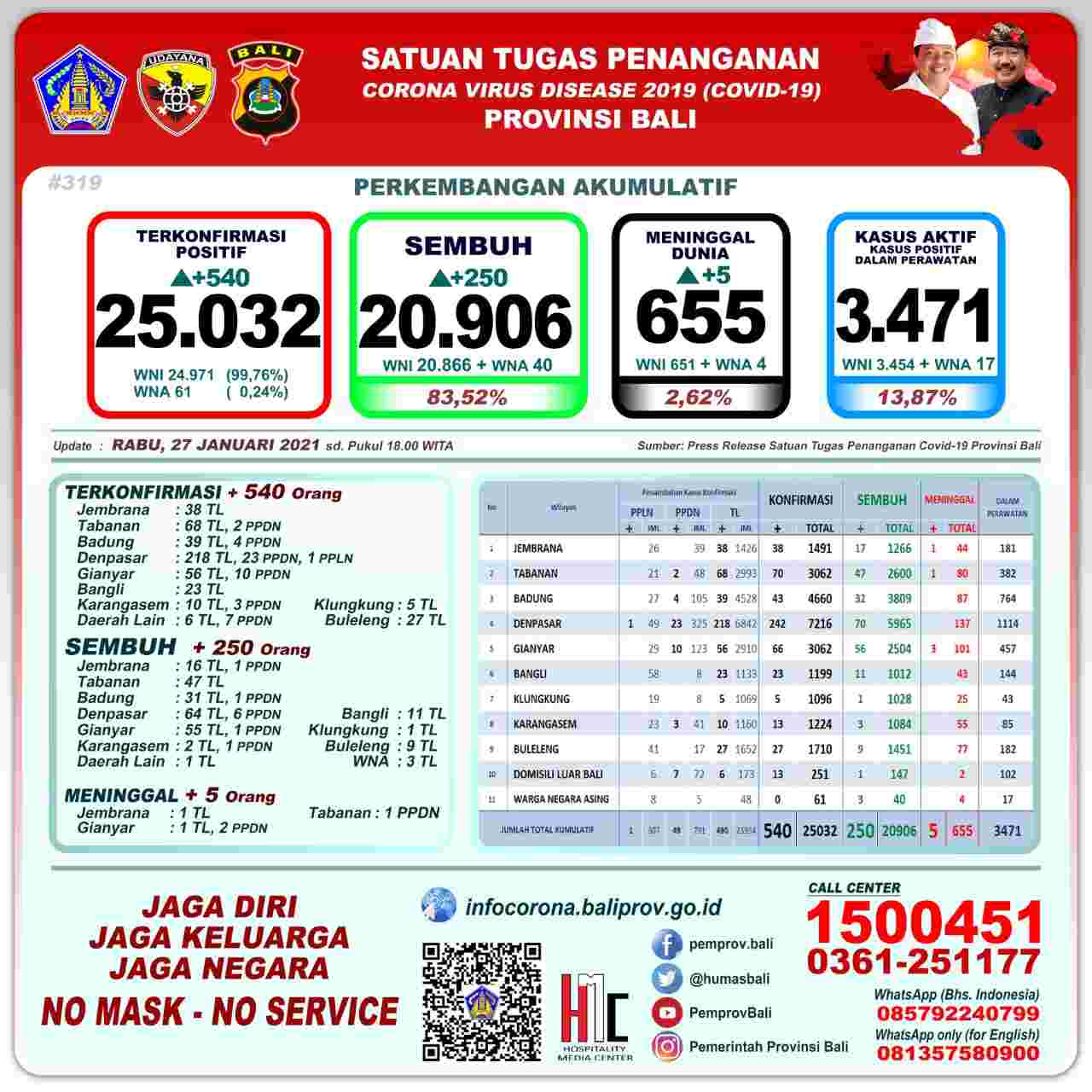 DIKSIMERDEKA.COM, DENPASAR, BALI – Ketua Harian Gugus Tugas Percepatan Penanganan Covid-19 (GTPP) Bali Dewa Made Indra dalam rilisnya menyatakan perkembangan Pandemi Covid-19 di Provinsi Bali per Rabu (27/1) tercatat pertambahan kasus terkonfirmasi sebanyak 540 orang (490 orang melalui transmisi lokal, 49 PPDN, dan 1 PPLN), sembuh sebanyak 250 orang, dan 5 orang meninggal dunia.