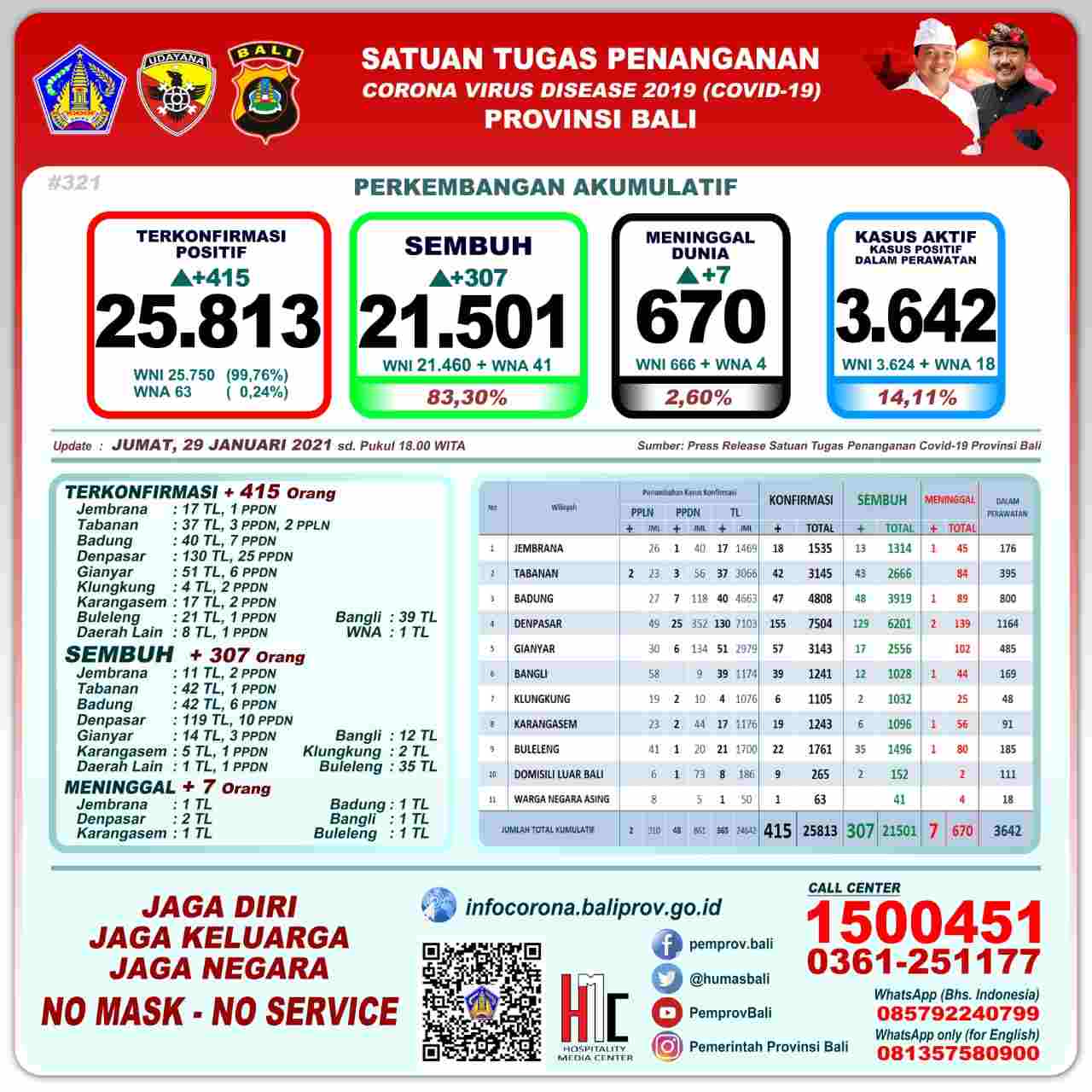 DIKSIMERDEKA.COM, DENPASAR, BALI – Ketua Harian Gugus Tugas Percepatan Penanganan Covid-19 (GTPP) Bali Dewa Made Indra dalam rilisnya menyatakan perkembangan Pandemi Covid-19 di Provinsi Bali per Jumat (29/1) tercatat pertambahan kasus terkonfirmasi sebanyak 415 orang (365 orang melalui transmisi lokal, 48 PPDN, dan 2 PPLN), sembuh sebanyak 307 orang, dan 7 orang meninggal dunia.