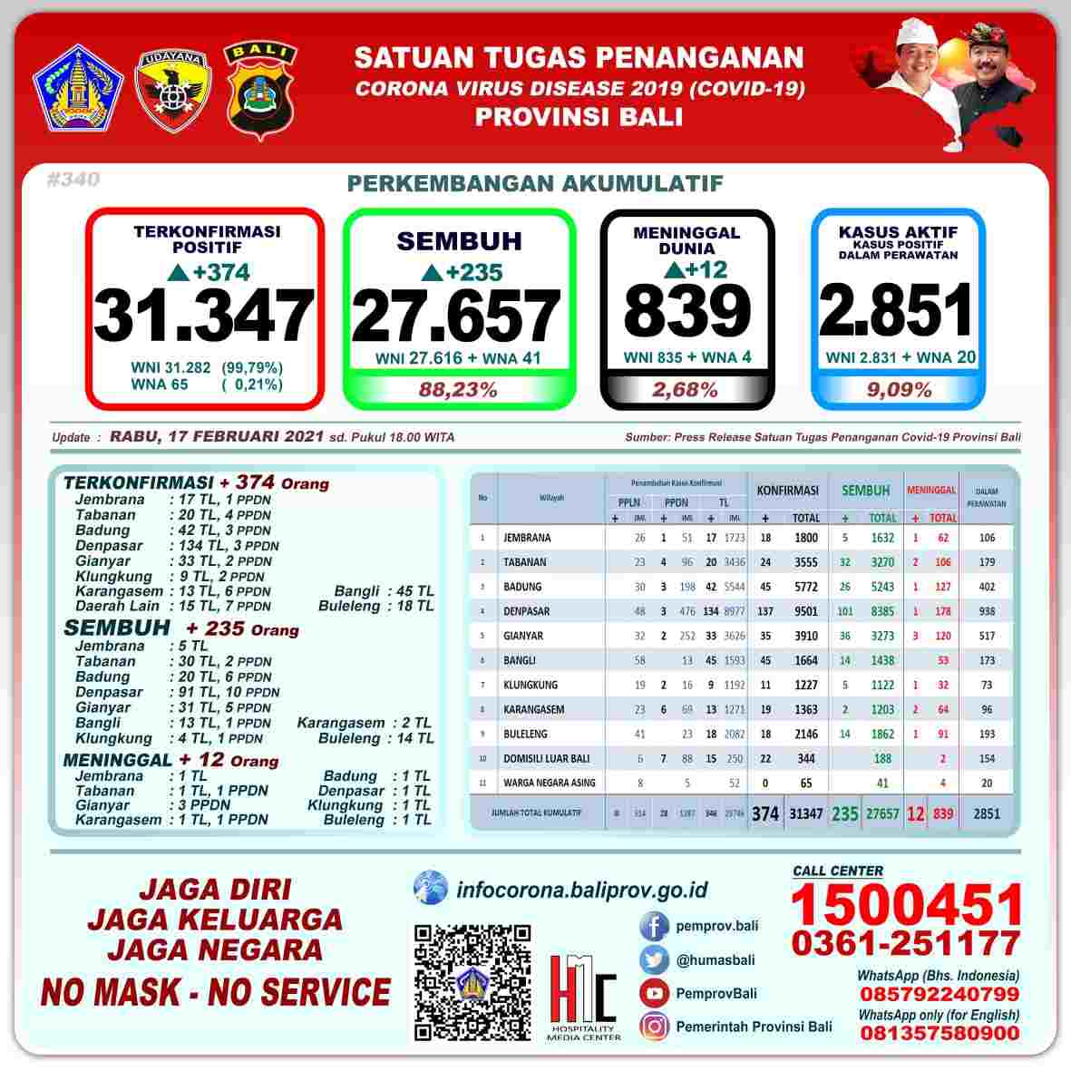DIKSIMERDEKA.COM, DENPASAR, BALI – Ketua Harian Gugus Tugas Percepatan Penanganan Covid-19 (GTPP) Bali Dewa Made Indra dalam rilisnya menyatakan perkembangan Pandemi Covid-19 di Provinsi Bali per Rabu (17/2) tercatat pertambahan kasus terkonfirmasi sebanyak 374 orang (366 orang melalui transmisi lokal, dan 28 PPDN), sembuh sebanyak 235 orang, dan 12 orang meninggal dunia.