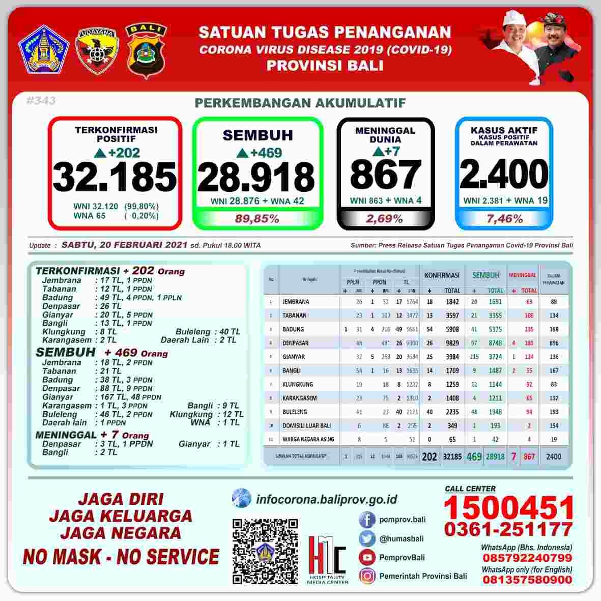 DIKSIMERDEKA.COM, DENPASAR, BALI – Ketua Harian Gugus Tugas Percepatan Penanganan Covid-19 (GTPP) Bali Dewa Made Indra dalam rilisnya menyatakan perkembangan Pandemi Covid-19 di Provinsi Bali per Sabtu (20/2) tercatat pertambahan kasus terkonfirmasi sebanyak 202 orang (189 orang melalui transmisi lokal, 12 PPDN, dan 1 PPLN), sembuh sebanyak 469 orang, dan 7 orang meninggal dunia.