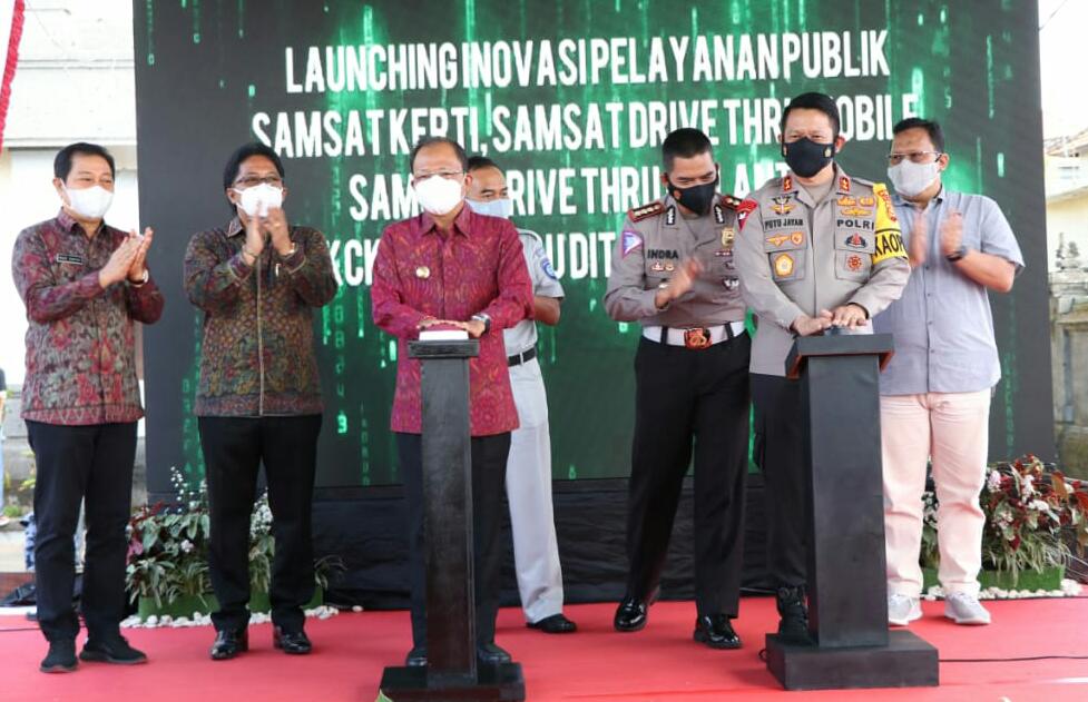 Sementara itu Kapolda Bali, Irjen Putu Jayan Danu Putra dalam sambutannya melaporkan Inovasi Pelayanan Publik Samsat Kerti, Samsat Drive Thru Mobile, Samsat Drive Thru Ditlantas dan Inovasi SKCK Drive Thru Dit Intelkam Polda Bali merupakan upaya untuk menghindari kerumunan dengan mengoptimalkan pendapatan daerah. Sehingga Polri bersama instansi terkait menyelenggarakan pelayanan publik dengan melakukan terobosan-terobosan melalui inovasi yang bisa dilakukan dimana saja, kapan saja, dan one top service.