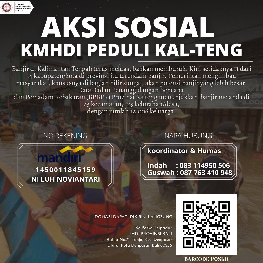 DIKSIMERDEKA.COM, DENPASAR, BALI – Kesatuan Mahasiswa Hindu Dharma Indonesia (KMHDI) Provinsi Bali ajak seluruh elemen masyarakat galang solidaritas untuk banjir di Kalimantan Tengah. Intensitas curah hujan yang cukup tinggi beberapa pekan terakhir, mengakibatkan 12 Kabupaten dan Kota di Bumi Tambun Bungai itu terendam banjir.
