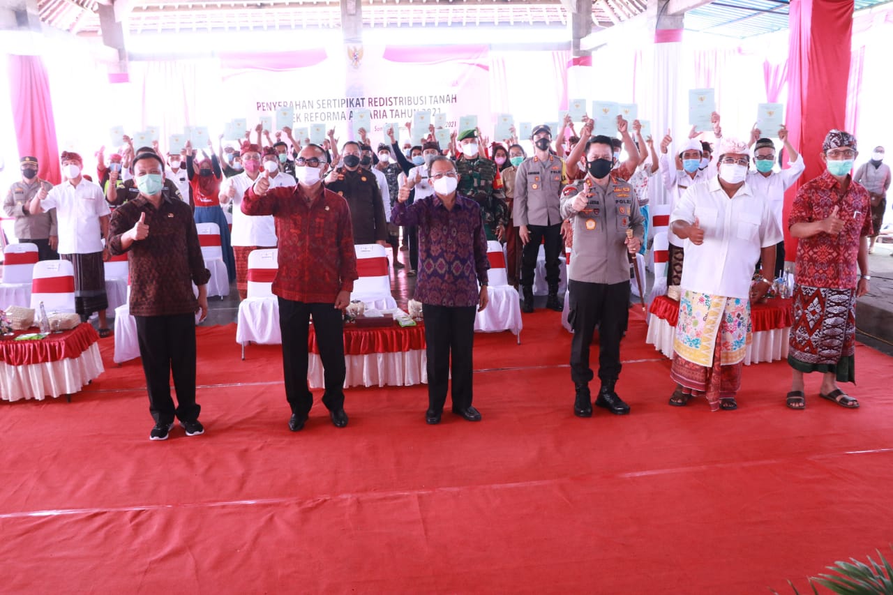 DIKSIMERDEKA.COM, BULELENG, BALI – Gubernur Bali, Wayan Koster serahkan sertifikat hak milik tanah garapan kepada warga Desa Sumberklampok, Kecamatan Gerokgak, Kabupaten Buleleng, pada Rabu (22/9). Sesuai rencana, Kepala Kantor Wilayah Badan Pertanahan Nasional Provinsi Bali telah menyelesaikan sebanyak 813 sertifikat pada tahap kedua, yang merupakan kelanjutan 800 sertifikat tanah tempat tinggal yang sudah diserahkan pada tanggal 18 Mei 2001 yang lalu.