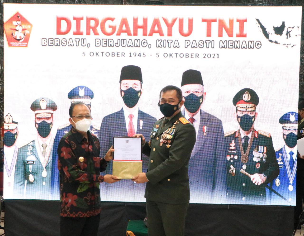 DIKSIMERDEKA.COM, DENPASAR, BALI – Gubernur Bali Wayan Koster menyerahkan sertifikat tanah hibah seluas 1,7 hektar (ha) kepada Pangdam IX/ Udayana Mayjen TNI Maruli Simanjuntak yang akan digunakan untuk pembangunan perumahan bagi prajurit TNI AD, di Hall Makodam IX/ Udayana, Denpasar, serangkaian Peringatan HUT TNI ke-76, pada Selasa (5/10).