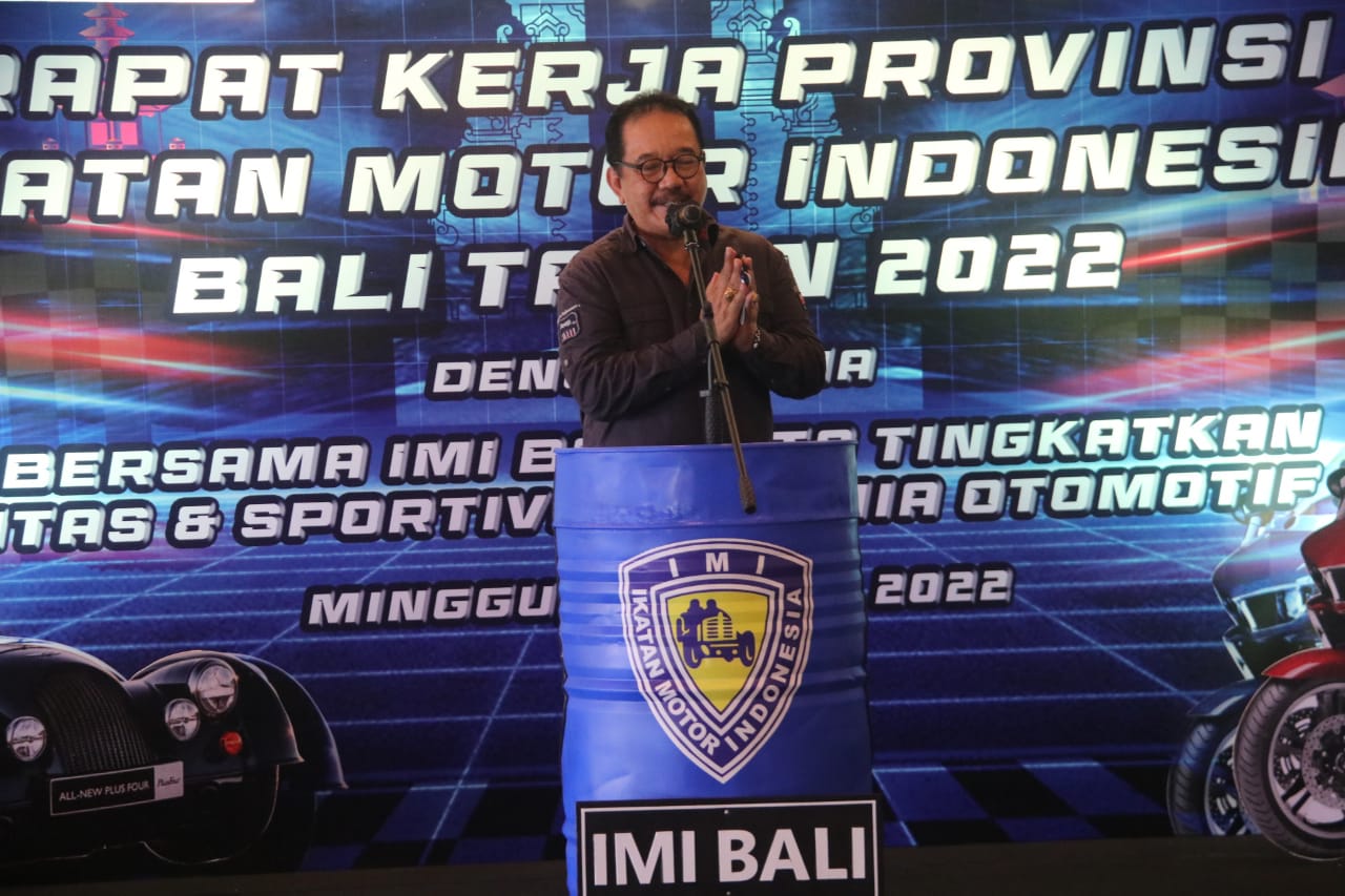 Wagub Cok Ace dalam sambutannya pada Rakerprov Ikatan Motor Indonesia Bali, di Krisna Oleh-Oleh Tuban, Badung, Minggu (24/4). (Foto: istimewa)