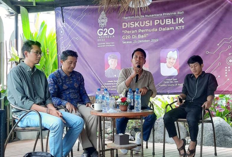 DIKSIMERDEKA.COM, DENPASAR, BALI Sembilan Resolusi sebagai rekomendasi untuk Konfrensi Tingkat Tinggi (KTT) G-20 Mencuat Dalam Forum Diskusi Publik yang diselenggarakan oleh Maritim Muda Nusantara Daerah Bali dengan mengangkat tema “Peran Pemuda Dalam KTT G-20 di Bali”, bertempat di Terali Resto, Denpasar, Selasa (25/10/2022).