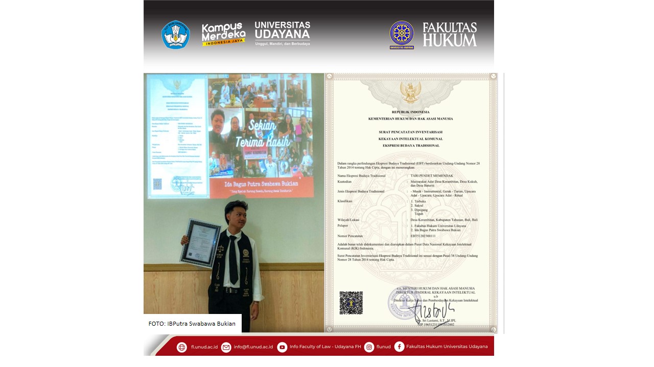 DIKSIMERDEKA.COM, BADUNG, BALI – Berawal dari penyusunan skripsi, Ida Bagus Putra Swabawa Bukian, mahasiswa Fakultas Hukum Universitas Udayana (FH Unud) berhasil memperjuangkan pencatatan Tari Pendet Memendak dalam Ekspresi Budaya Tradisional (EBT) ke Kantor Wilayah Kementerian Hukum dan Hak Asasi Manusia (Kanwil Kemenkumham) Bali.
