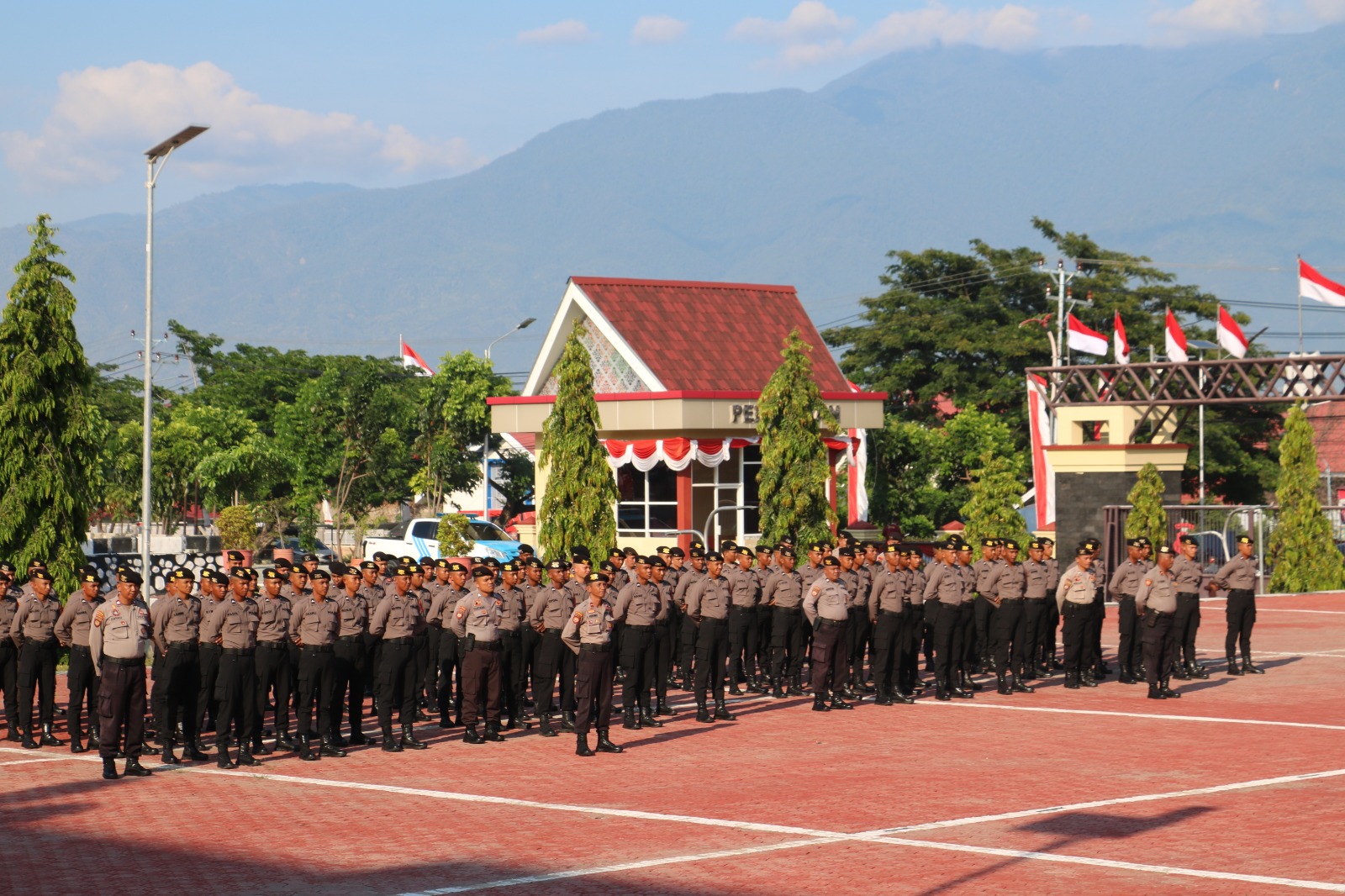 Apel pasukan Polda Sulteng persiapan pengamana kunjungan Presiden Jokowi ke Kota Palu, Senin (28/8/23). Foto: Rahmad Nur/diksimerdeka.com)