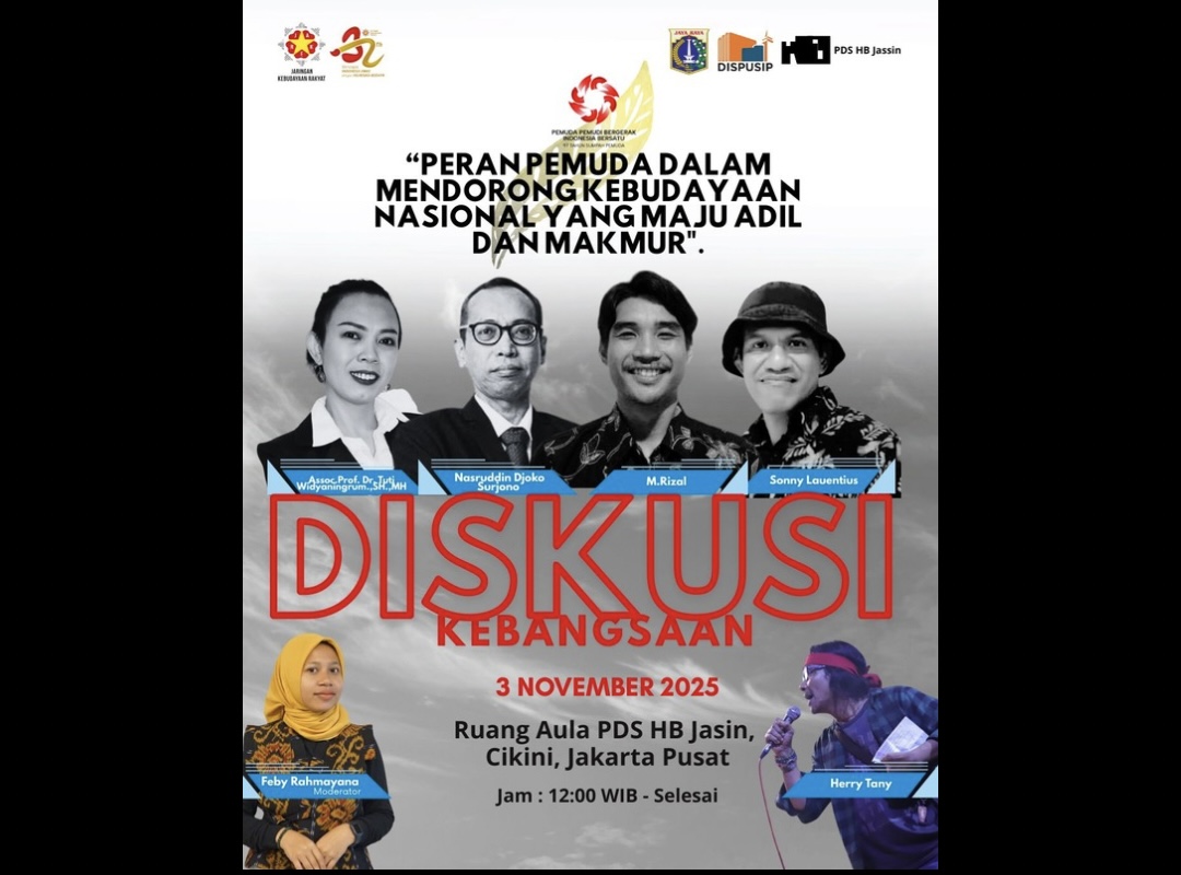 DIKSIMERDEKA.COM, JAKARTA — Dalam semangat memperingati 97 tahun Sumpah Pemuda, Jaringan Kebudayaan Rakyat (JAKER) akan menggelar Diskusi Kebangsaan bertajuk “Peran Pemuda dalam Mendorong Kebudayaan Nasional yang Maju, Adil, dan Makmur” di Taman Ismail Marzuki pada 3 November 2025.