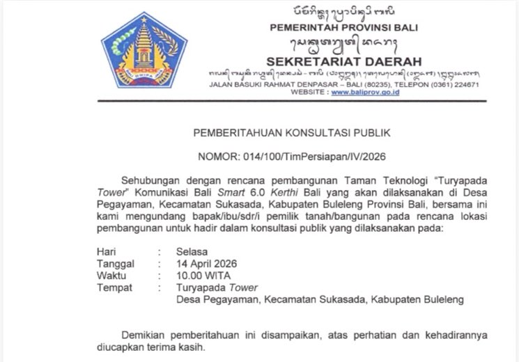 Konsultasi publik tersebut dijadwalkan berlangsung pada Selasa, 14 April 2026, pukul 10.00 WITA, bertempat di lokasi Turyapada Tower, Desa Pegayaman, Kecamatan Sukasada.