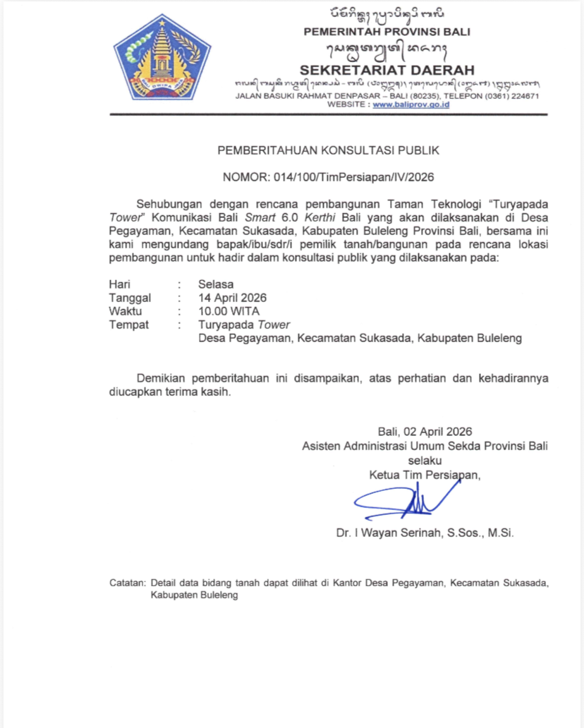 Asisten Administrasi Umum Sekretaris Daerah Provinsi Bali selaku Ketua Tim Persiapan, Dr. I Wayan Serinah, S.Sos., M.Si., dalam surat tersebut menyampaikan bahwa konsultasi publik ini merupakan bagian dari tahapan persiapan pembangunan proyek Taman Teknologi Turyapada Tower.