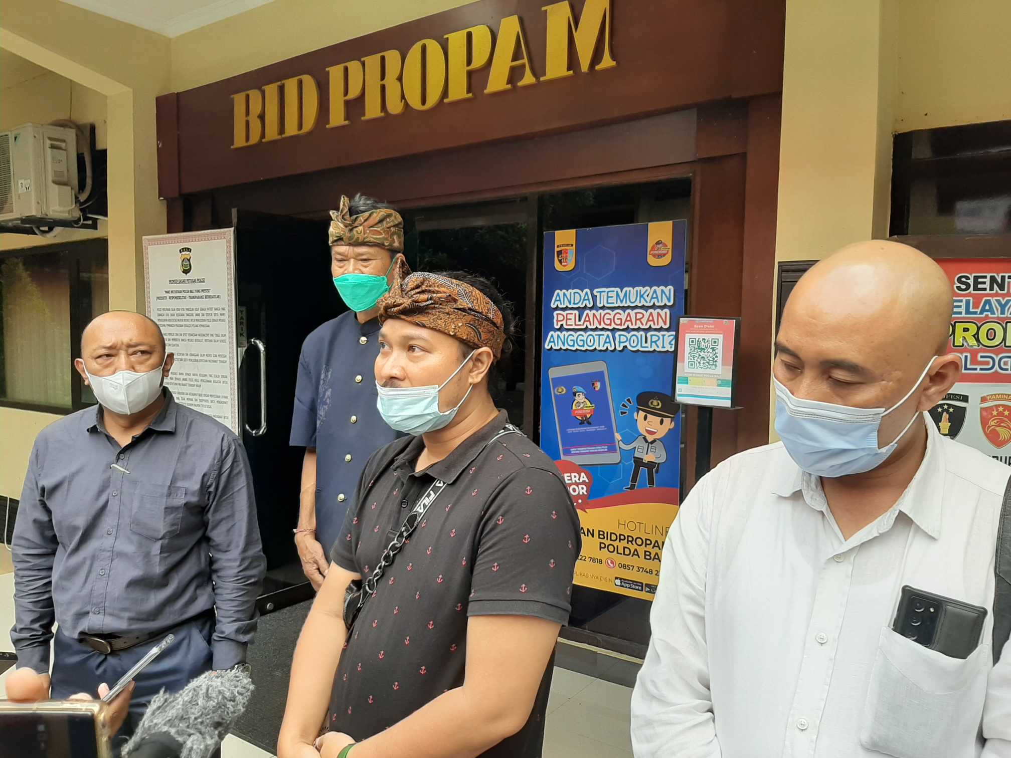 Ahli waris tanah sengketa di Ungasan didampingi penasihat hukumnya saat melapor ke Propam Polda...